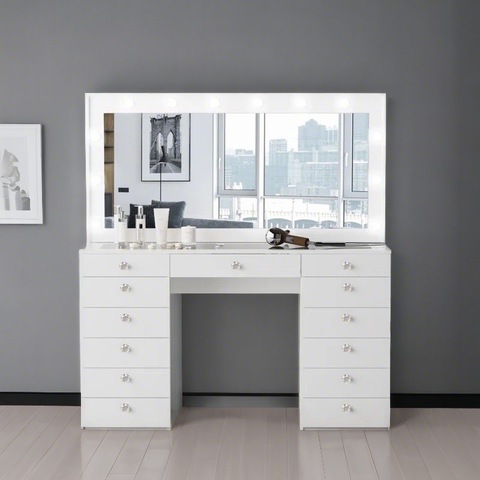 Sang trọng lớn Led Gương 13 ngăn kéo make up dressers Vanity bàn Glass Top melamine trang điểm bằng gỗ Vanity bàn trang điểm thiết kế
